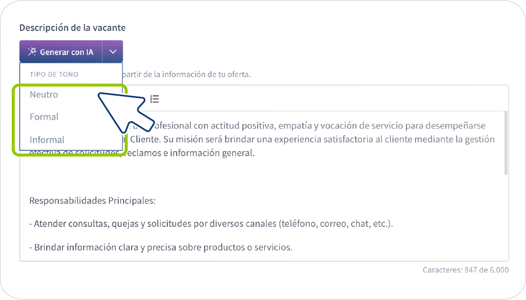 - Asistente de tono: Puedes pulir la redacción y ajustar el tono de voz (Formal 👔, Neutro 😐 o Informal 😎) para que la vacante refleje tu cultura empresarial.