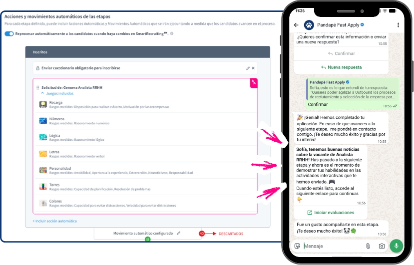 - Flujo en WhatsApp: El candidato responde los filtros iniciales y, si es apto, recibe inmediatamente el paquete de evaluaciones Genoma en el chat.
