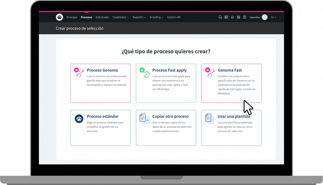 - Al iniciar, selecciona la opción Proceso Genoma Fast y elige el modelo de evaluación (por cargo, nivel jerárquico o personalizado).