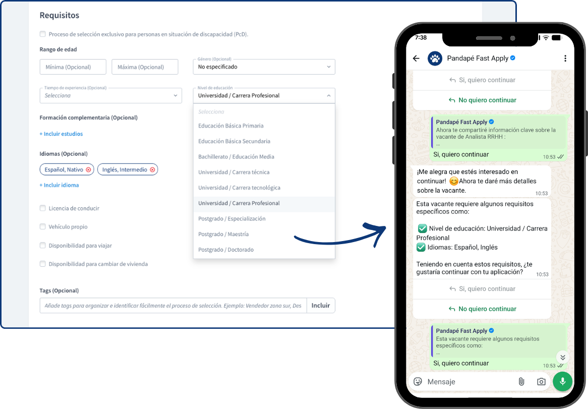 En esta etapa defines cómo interactuará el agente de WhatsApp con el candidato: