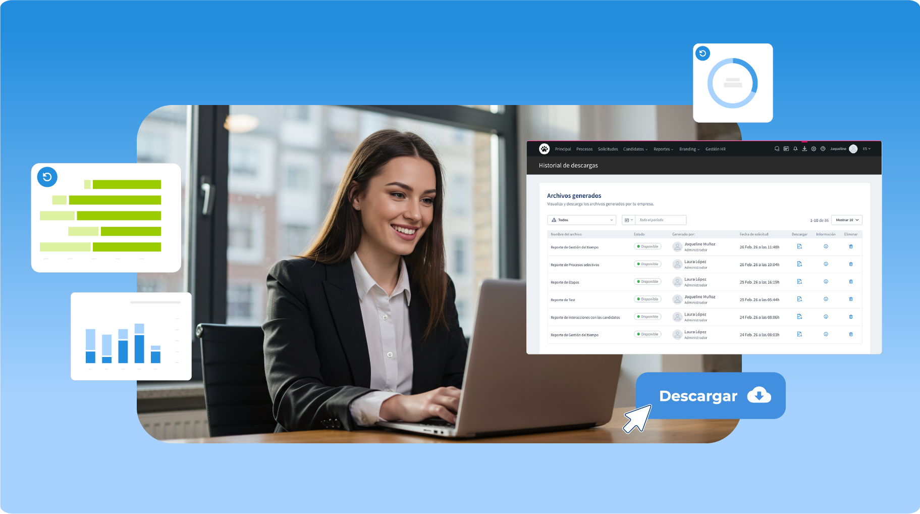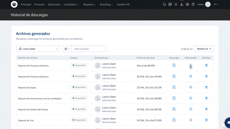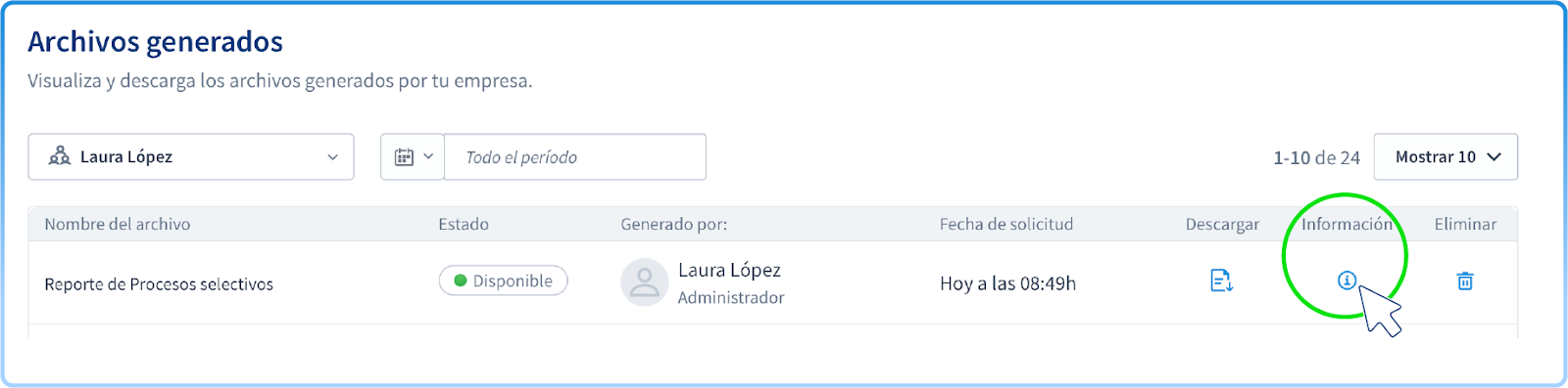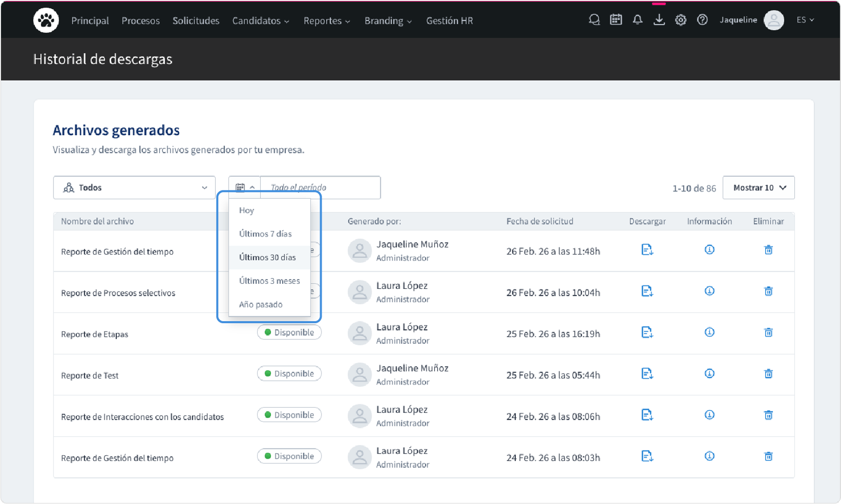 Esto te brinda un segundo canal de acceso a la información: si por cualquier motivo no encuentras el archivo en tu correo, siempre lo tendrás disponible y localizable en la plataforma. Además, obtendrás una trazabilidad superior, ya que podrás identificar quién generó el reporte, la fecha de exportación y los filtros exactos aplicados en cada archivo.