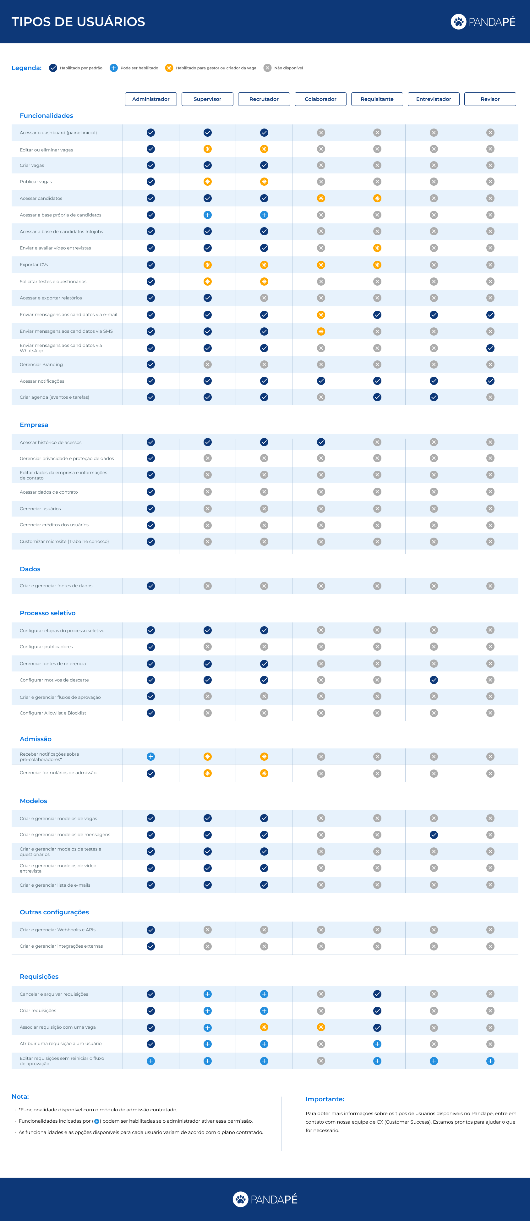 Para obter mais detalhes sobre as funções e permissões do Pandapé, recomendamos que você faça o download do documento em PDF que disponibilzamos a seguir.
