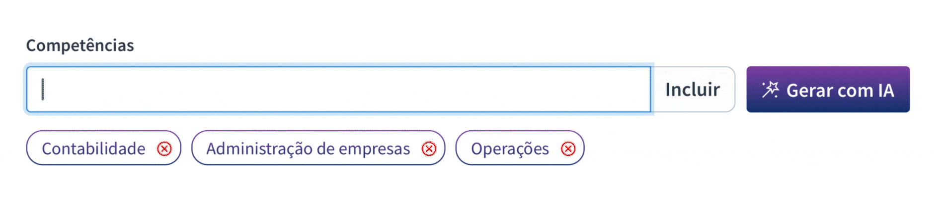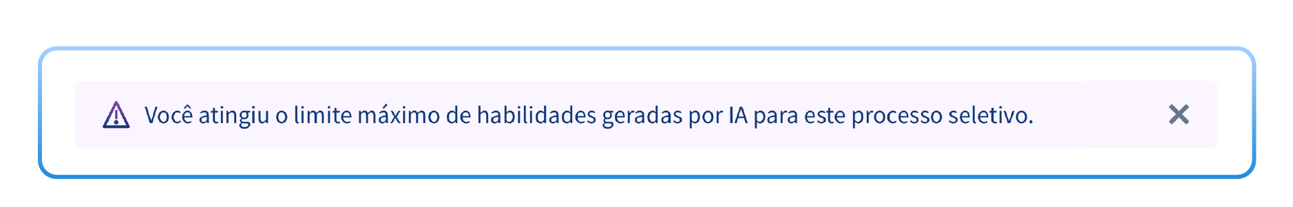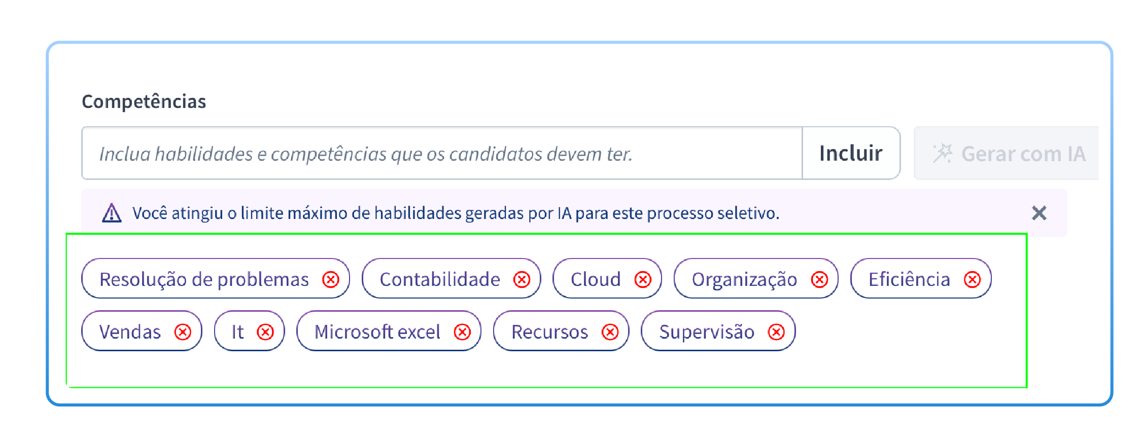 - Novas sugestões: se você já gerou as 10 habilidades e precisa de um conjunto diferente, atualize o título e a descrição da vaga para que a IA possa propor novas habilidades.